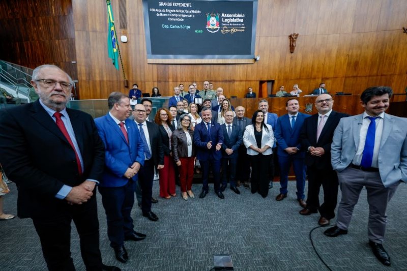 O Grande Expediente na sessão desta terça-feira (18/11), no Salão 20 de Setembro da Assembleia gaúcha, proposto pelo Deputado Carlos Búrigo, foi de homenagem aos 188 anos da Brigada Militar: “Uma História de Honra e Compromisso com a Comunidade.” Ao lado do presidente da Assembleia, Deputado Pepe Vargas, participaram da solenidade o secretário estadual de Segurança Pública, coronel Mario Ikeda e a secretária-adjunta Adriana Regina da Costa, o comandante-geral da Brigada Militar, coronel PM Cláudio Feoli, o subcomandante-geral da Brigada Militar, coronel PM Douglas da Rosa, o chefe do estado-maior da Brigada Militar, coronel PM Luigi Soares, a representante do Ministério Público, promotora Anelise Rertel Gress, e a subdefensora pública-geral Silvia Pinheiro de Brum. Praças e oficiais ocuparam as galerias do plenário, além da Banda da Ajudância-Geral da Brigada Militar que apresentou “Eu Sou do Sul”, de Os Serranos, entre outras canções.